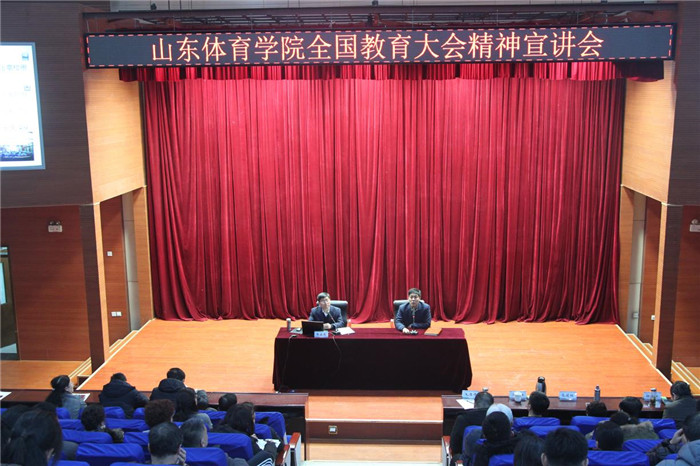 毛德伟对宣讲会进行了总结,认为全国教育大会精神宣讲会讲得好,内容丰富,讲解准确、透彻;他强调指出,当前及今后一个时期,学校将坚持立德树人一条主线,牢牢把握学校建设发展目标,明确建设一流学科、争取博士授权单位两个主要任务,努力做好加快学科专业建设步伐、加强团队建设、研究制定一流本科建设实施方案、对接需求服务社会、加强学校综合改革、充分发挥好体育科技创新服务平台作用、推进日照校区和济南校区同步发展、加大教师队伍建设等等重要工作。广大师生员工要团结一致,开拓进取,增强责任感和使命感,在新的时期共同为建设国际知名、国内著名、特色鲜明的应用型专业体育院校而努力奋斗。