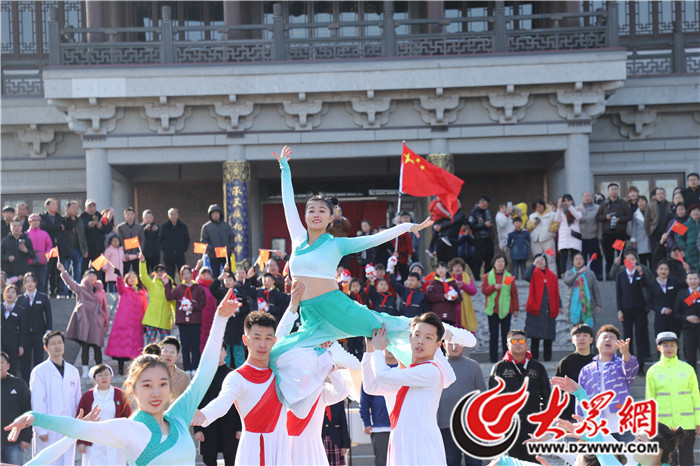 山东体育学院体育艺术学院师生们为此次活动专门编排了贴合主题和场地的舞蹈节目,舞姿既有优美之韵也展现出阳刚之气,让他们的青春美丽绽放在大明湖畔,引得大家纷纷参与进表演的队伍中,无畏冬天的寒冷,与表演者们一起挥舞手中的红旗,唱出时代赞歌。