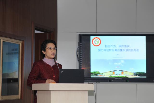 毛莉虹作了题为《担当作为、狠抓落实,努力开创校区高质量发展的新局面》的讲话。她指出,经过近二十年的努力,特别是十八大以来,在学校党委的领导下,在历任校区管委会主任原维佳副院长、谷忠德副院长的带领下,日照校区的人才培养质量、师资队伍建设、学风建设、教学质量保障体系、竞赛训练、开发培训、基础设施、校容校貌、平安校园等建设取得了历史性的突出成绩。她表示,来到日照校区自己会坚决拥护和服从校党委的决定,牢记责任、担当作为,尽职履责,坚定信心,继往开来,狠抓落实。会上,她向大家传达了全省“担当作为、狠抓落实”大会精神以及全省教育大会和全省教育工作会议精神。她强调,校区要转变作风,各级领导要深入一线亲自推动重点任务、重点工程,要拉高思想境界和高质量发展的“双重标杆”,强化“磁场”效应。她结合教育大会的学习体会,按照学校党委工作思路和重大改革安排,对日照校区2019几项重点工作做了整体部署:一是齐力并发,形成校区高质量发展的精神合力。她要求,各党总支(学院、部门、单位),及各党支部、各教研室,要学习贯彻全省会议精神,抓好思想动员和调研,建立校区干部联系教研室、学生班级、党支部制度和表彰奖励机制。二是聚焦校区内涵建设,进一步拓展校区高质量发展的有效途径。一方面要实施“拉高标杆”行动计划拓展高质量发展的发力点,另一方面要进一步筑牢学科建设的龙头引领地位。同时,要“以本为本”,奋力打造一流专业、一流课程,提高人才培养质量。三是创新发展,做优做强,进一步塑造校区高质量发展的特色优势。要继续做优做强校区竞赛与训练、培训服务与交流、竞技体育重点实验室、军民融合的特色优势,努力打造校区“三全”育人工程的品牌优势。继续做好竞赛与训练工作,不断开拓创新,圆满完成培训开发工作。同时,做好国家体育总局田径管理中心、举重管理中心、外国国家专业队的集训服务工作,注重创新人才培养模式。四是强化党建引领,加强人才与师资团队建设,建设平安校园,进一步筑牢校区高质量发展的引擎与保障。最后,她表示,今天接过接力棒,站在巨人肩膀上,在校党委的领导下,她将与日照校区全体教职员工一道,团结拼搏,狠抓落实,以“功成不必在我,功成一定有我”的历史担当,共同开创校区高质量发展的新局面。
