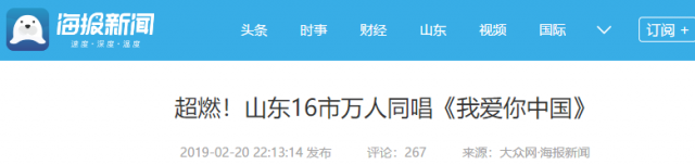大众网·海报新闻济南2月20日讯(记者 冯媛媛)你有多久没说过一句“我爱你中国”了?如果有机会跟成百上千人齐声共唱《我爱你中国》,将是怎样激动人心的场面?今年是中华人民共和国成立70周年,新春佳节之际,海报新闻客户端在山东16个地市同步开展“逐梦新时代 美丽中国年”新春快闪活动,累计超过万人共同唱响《我爱你中国》,向祖国母亲深情表白,向新中国成立70周年献礼!