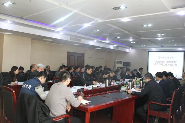 会议为时一天,围绕贯彻落实全省“担当作为、狠抓落实”工作动员大会精神,主要研讨了今年重点工作任务的实施方案。会议采用“部门述、领导点、同志评”的方式,20个部门(单位)的主要负责人结合学校发展和实际工作,分别就本部门(单位)2019年重点工作“干什么、怎么干、什么时间干完”汇报了工作思路和想法;相关部门(单位)的负责同志提出了意见建议,交流了体会;校领导对各部门工作情况逐一进行了点评,提出了要求。