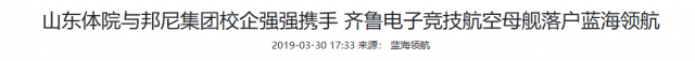 3月30日,山东体育学院与邦尼集团有限公司在2019山东省体育产业发展大会上签署战略合作协议,双方将合作建设全国第一家普通高等院校电子竞技学院,在蓝海领航大数据产业园共建北方最大电子竞技复合型人才培养平台和全产业链生态圈、孵化器。