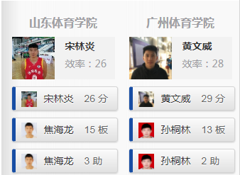 山东体育学院方面,宋林炎26分9篮板,焦海龙17分15篮板,周楠23分。广州体育学院方面,黄文威29分9篮板,孙桐林21分13篮板,杨金蒙11分。