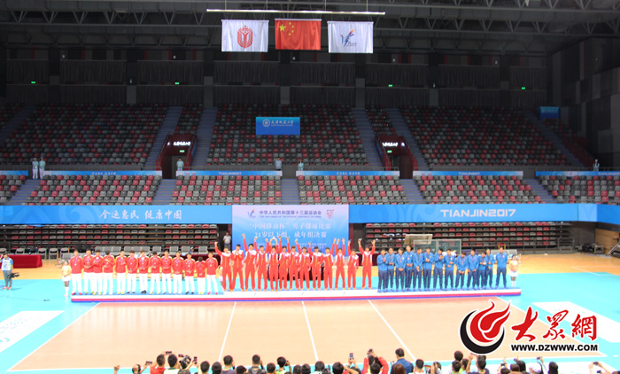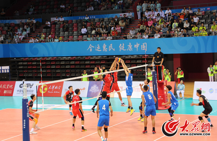8月25日,第十三届全运会男排U21(21岁以下组)比赛中,山东队以大比分3:0的绝对优势战胜浙江队,夺得了第十三届全运会男排U21决赛金牌(图片中红色服装为山东队)