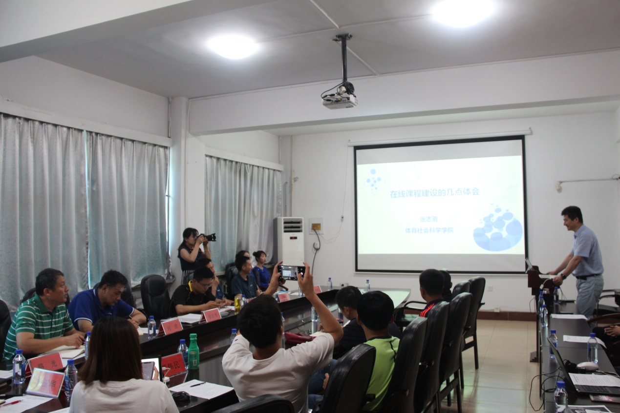 研讨会上,体育社会科学学院院长张志勇教授结合本院实践探索,以《体育教学论》在线开放课程建设为例,阐述当前在线课程建设的背景、流程和建议。竞技体育与体育教育学院网球课程负责人梁高亮、田径课程负责人李梅、跆拳道课程负责人王增平、足球课程负责任赵勇、篮球课程负责人赵世飞分别介绍了网球、田径、跆拳道、足球、篮球等五门课程的在线建设情况。会议邀请“超星”公司有关专家对教育部和山东省教育厅关于课程建设“双万计划”以及国家级精品在线开放课程评审标准等进行了解读。