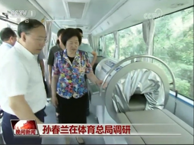 期间,在国家体育总局局长苟仲文等人的陪同下,孙春兰登上山东体育学院派出的备战东京奥运会科技保障车,与山东体育学院康比特运动与健康学院黄老师、司机于师傅亲切握手。接着,孙春兰详细询问了科技保障车的用途,仪器设备的名称和作用,每一个仪器设备都问到了。黄老师一一作了回答。山东体育学院科技保障车主要是为了运动员比赛期间能得到及时的科技服务和保障,黄老师重点介绍了山东省自行研制的负压体能恢复舱的原理以及在大强度训练、冬季项目训练及高原训练方面对疲劳恢复的促进作用。