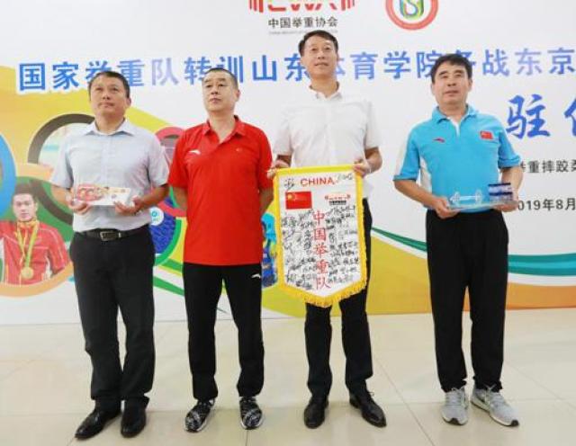 入驻仪式上,国家举重队领队杨谦向山东体育学院赠送由国家举重队全体队员签名的国家队队旗、举重杠铃模型和奥运队员邮封。