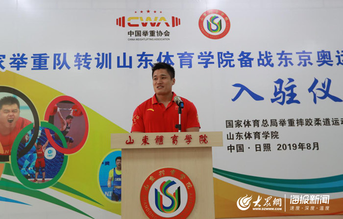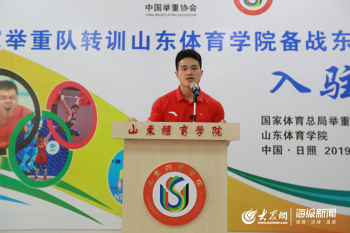 奥运金牌教练员、国家举重队男队主教练于杰代表入驻队伍发言,感谢山东省体育局、山东体育学院为国家举重队在训练、食宿、场馆设施方面所做的工作。他要求全体将士团结一心,严精细实,始终怀揣报国之心,积极备战东京奥运会,为国家争光,为民族添彩。 最后他以诗明志表达转训日照备战东京奥运为赢而战的豪气:“日出东方必先照,壮士临阁只为战。百年屈辱不复还,沙场点兵定凯旋!”