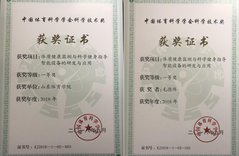 由山东体育学院毛德伟教授作为第一完成人,山东体育学院与泰山体育产业集团、深圳泰山体育科技股份有限公司、山东省体育科学研究中心联合研发的“体质健康监测与科学健身指导智能设备的研发与应用”项目,荣获2018年中国体育科学学会科学技术奖一等奖。