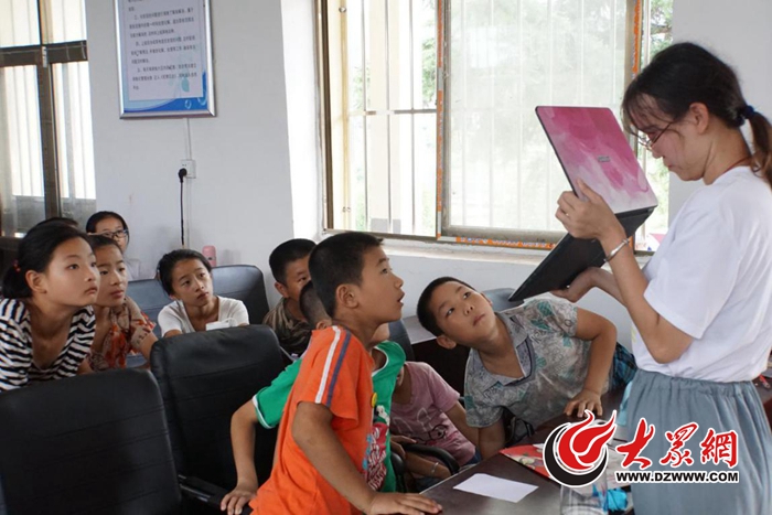 在会议室充当的教室,来自山东体育学院爱新集结号团队的成员发挥自己的专业优势为孩子们讲授了一堂新闻专业课。课上,来自新闻专业的队员们为孩子们讲述了什么是新媒体,以及新媒体的影响。通过一个个生动的事例和对比,孩子们以自己现有的知识面理解了新媒体、新闻媒体。未来的他们一定会走出村庄,走向城市,以仲山村人的姿态拥抱新媒体的时代。