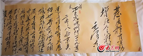 王爱成先生,既是诗人,又是书法家,擅长毛体。他非常关注我国体育事业的发展,尤其是大型赛事赛况,先后为奥运会、亚运会、全运会写过诗词百余篇。2008年,北京奥运会让中国人的“百年奥运梦想”成功实现,举国为之沸腾,王爱成跟踪奥运圣火的传递历程,感怀祖国的繁荣进步,人民的幸福安康,他纵横豪情于笔端,用诗歌的形式记录了“祥云”火炬在中国大地传递的109个城市和地区的历史名胜、风土人情以及所在地人们对奥运的热情和欢呼,抒发了对伟大祖国和人民的满腔热爱之情。值齐鲁体育文化遗产博物馆建设之际,特毛体手书百米长卷致贺。