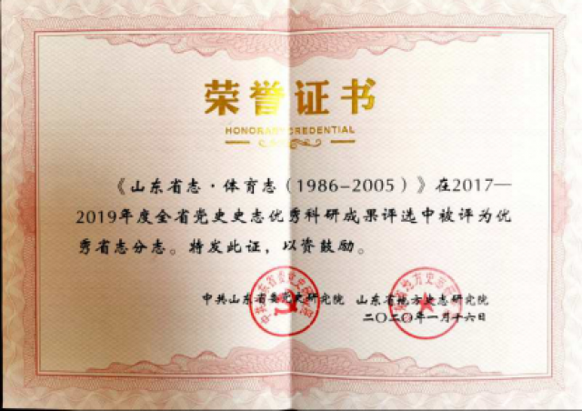 《山东省志 f 体育志(1986-2005)》在2017-2019年度全省党史史志优秀科研成果评选中,被评为优秀省志分志。
