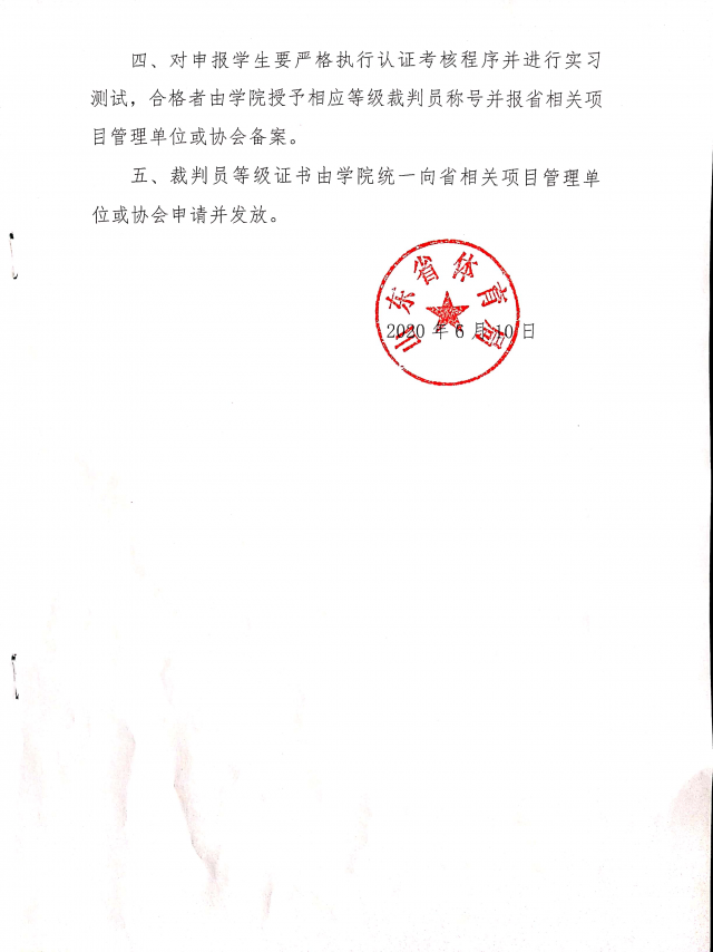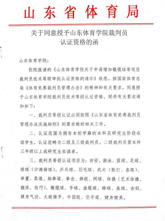 山东体育学院肩负着培养体育人才、服务体育强国建设的使命。学校十分重视学生技能培养和提升,单招项目二、三级裁判员审批资格的全覆盖,将进一步促进在校生专业技能的培养水平,提升学生社会实践和就业能力。(竞赛训练处 温晓东)