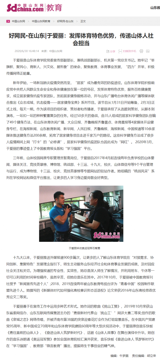 原文链接:好网民·在山东|于爱丽:发挥体育特色优势,传递山体人社会担当_教育频道_中国山东网_中国山东网 (sdchina.com)
