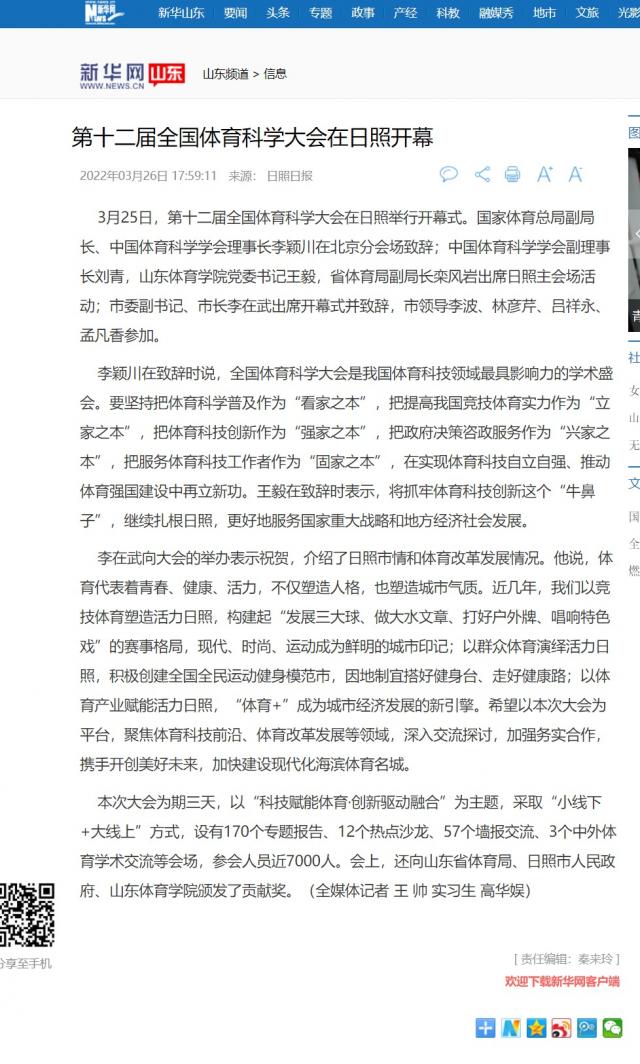 原文链接:第十二届全国体育科学大会在日照开幕-新华网山东频道 (news.cn)