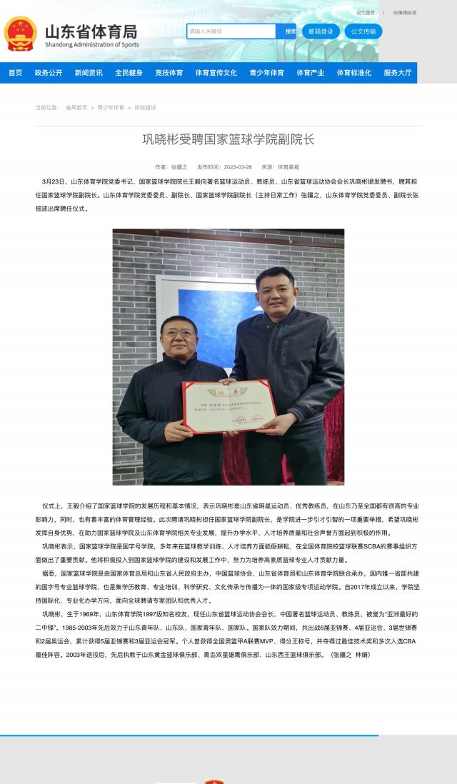 【山东省体育局】巩晓彬受聘国家篮球学院副院长