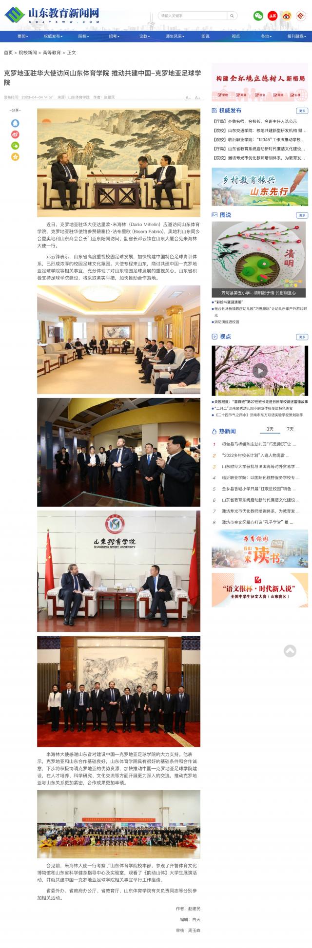 【山东教育新闻网】克罗地亚驻华大使访问山东体育学院 推动共建中国-克罗地亚足球学院