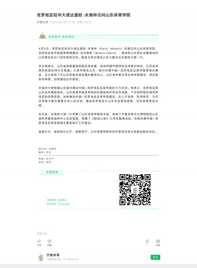 【齐鲁体育】克罗地亚驻华大使达里欧·米海林访问山东体育学院
