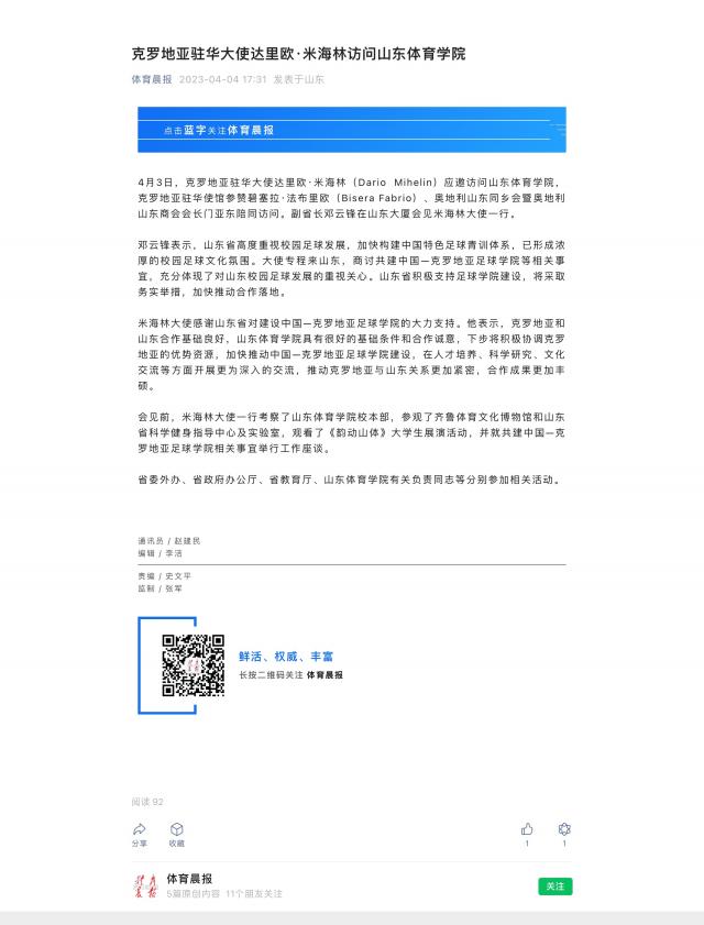 【体育晨报】克罗地亚驻华大使达里欧·米海林访问山东体育学院