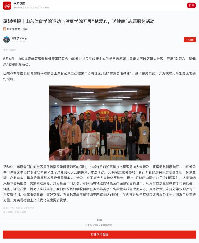 【学习强国】融媒播报|山东体育学院运动与健康学院开展“献爱心,送健康”志愿服务活动