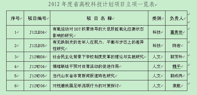 近日,省教育厅公布了2012年山东省高等学校科研发展计划评审结果,我院6项课题获得立项,其中科技项目2项,社科项目4项。立项名单见下表。