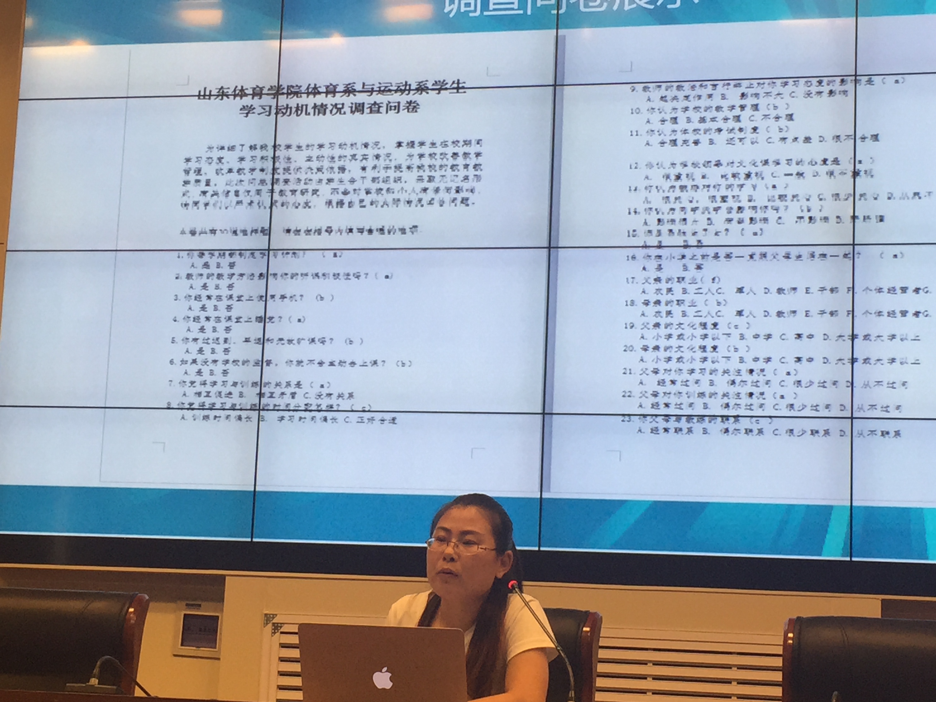“超声波治疗山东女篮青年队运动员髌腱末端病的临床研究”等21个本科生科研计划项目课题组负责同学分别就课题开展情况、目前存在问题、下阶段计划等情况进行了报告。与会专家在认真查阅材料和听取汇报后,对各团队近半年来取得的成绩与存在的问题进行了点评,并对下一步发展提出了宝贵意见和建议。山东体育学院 Fn+p\P‑n%o z汇报后,科研处集中课题组成员针对科研经费的合理使用等问题进行了相应的培训。