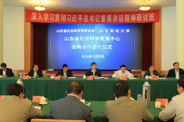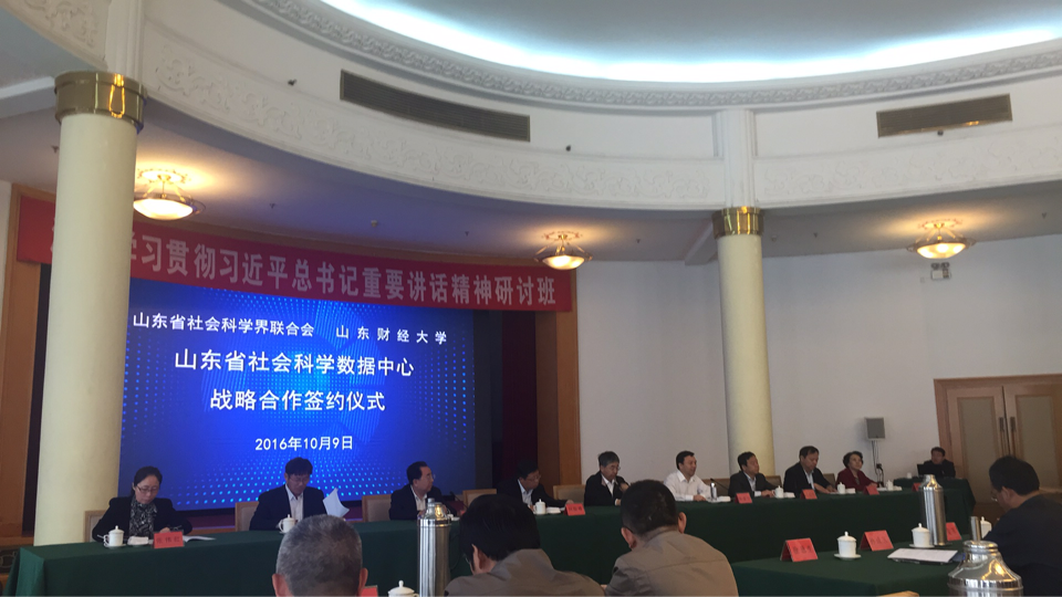 10月9日——10日,由山东省社科联组织的全省社科界《深入学习贯彻习近平总书记重要讲话精神研讨班》在南郊宾馆举行。这次研讨班是将学习贯彻习近平总书记重要讲话精神研讨会、山东省社会科学数据中心建设推进会、省社科联党组理论中心组(扩大)读书会和省社科工作会合并在一起召开。会议的主题是学习贯彻习近平总书记在哲学社会科学工作座谈会上和庆祝中国共产党成立95周年大会的讲话精神,贯彻落实中央、省委哲学社会科学工作座谈会精神,总结前段工作,部署今后任务,推动实施社会科学大数据战略,加快山东省社会科学数据中心建设。省委宣传部副部长、省社科联副主席徐向红出席会议并作动员讲话。省社科联党组书记、副主席林建宁,省政府研究室党组书记、主任、省社科联副主席刘险峰,山东财经大学党委书记王邵军,省社科联党组副书记、副主席周忠高,山东财经大学党委副书记车滨,省社科联副主席、党组成员张宏明、孙淑娜,省委宣传部理论处调研员殷玉平,省社科联秘书长、组联部部长张伟红出席开班式。