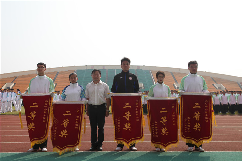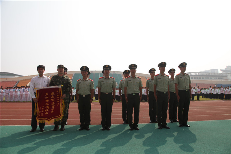 最后,校区对在军训工作中表现优秀的班级、辅导员进行了表彰。毛德伟向武警日照支队赠送锦旗。