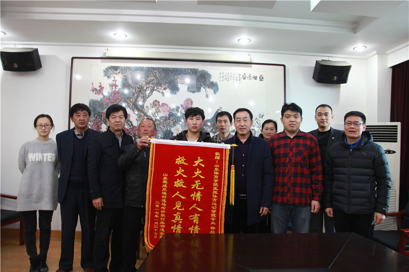 2月28日,火场救人学生许胜强同学家乡领导及获救老人家属一行4人,专程来到校区赠送锦旗并表达对学校培养和学生义举的感谢。校区管委会副主任单兆升,竞技体育学院党总支书记赵孝彬,校区办公室、学团部领导,辅导员张帆老师和许胜强同学一起参加会见并座谈。