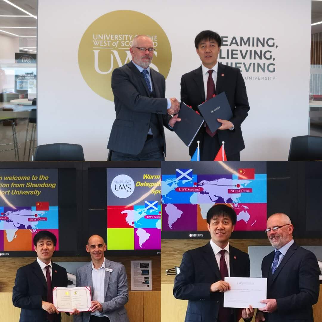 在英国西苏格兰大学访问期间,毛德伟与西苏格兰大学副校长斯蒂夫·奥利维签订了合作备忘录,双方同意在科研活动、师生交流、两校互访、信息交流及博士生培养、发展和指导等方面开展合作。斯蒂夫·奥利维代表学校聘请毛德伟为西苏格兰大学特聘教授。毛德伟给山东体育学院特聘教授——西苏格兰大学体育与生命科学学院教授、“2021年欧洲体育科学学会年会”主席戴维森颁发了特聘教授证书。代表团还与西苏格兰传媒学院、教育学院、工程学院等学院的院长就合作办学项目进行商谈,达成一定共识。