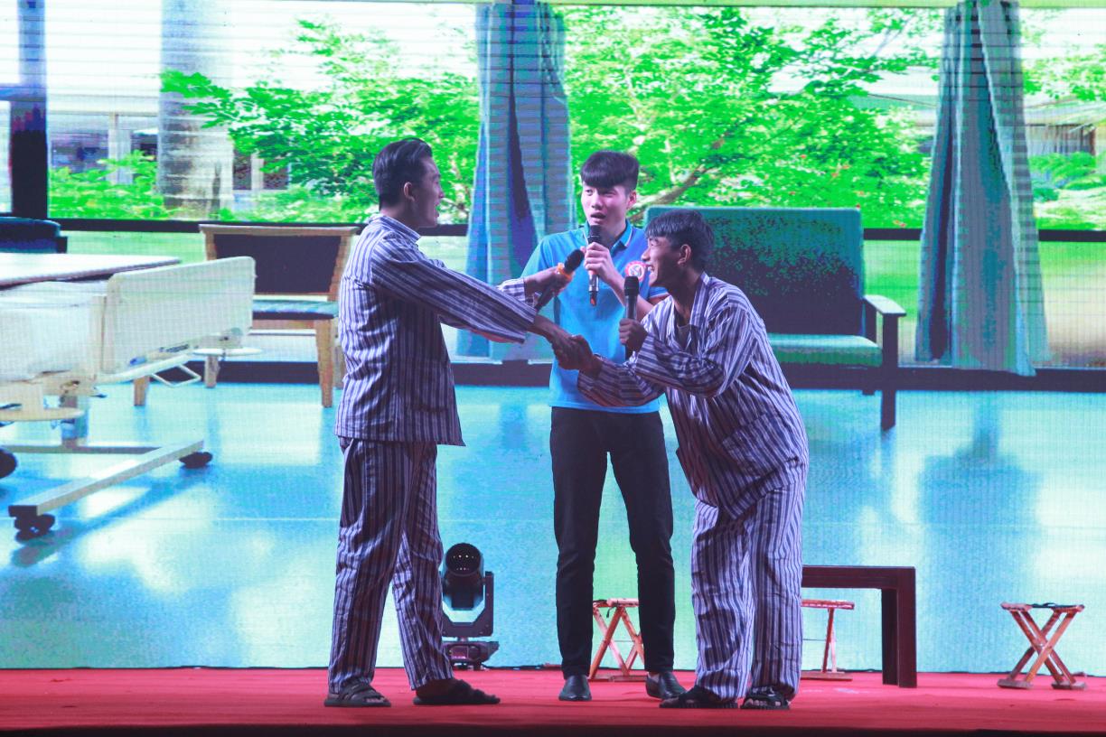 体育艺术学院选送的舞蹈《自由》拉开整台晚会序幕。运动与健康学院表演诗朗诵《光明》将观众带回到战火纷飞的年代,告诫青年人“珍惜和平,勿忘历史”;体育社会科学学院带来的舞台剧《志愿者的故事》,记录了山体青年坚持校外志愿服务的感人瞬间,展现山体人的无私与宽容。体育传媒与信息技术学院配乐诗朗诵《五四之火永不停息》表达了青年学生肩负继承、发扬“五四”精神使命的激情与豪迈。歌曲《国家》在男女二重唱的基础上,加入手语表演,即丰富了节目表达形式,又保留了“山体特色”。合唱《祖国不会忘记》一改往日“歌伴舞”的传统表达形式,由我校大学生退役士兵组成的军事爱好者协会编排的队形队列表演融入合唱中,丰富了山体人“家国情怀”的时代内涵。整台晚会内容丰富,呈现我校青年学生积极向上、勇于创新的精神风貌。他们将最崇高的理想寄予祖国,用青春谱写奋进乐章。