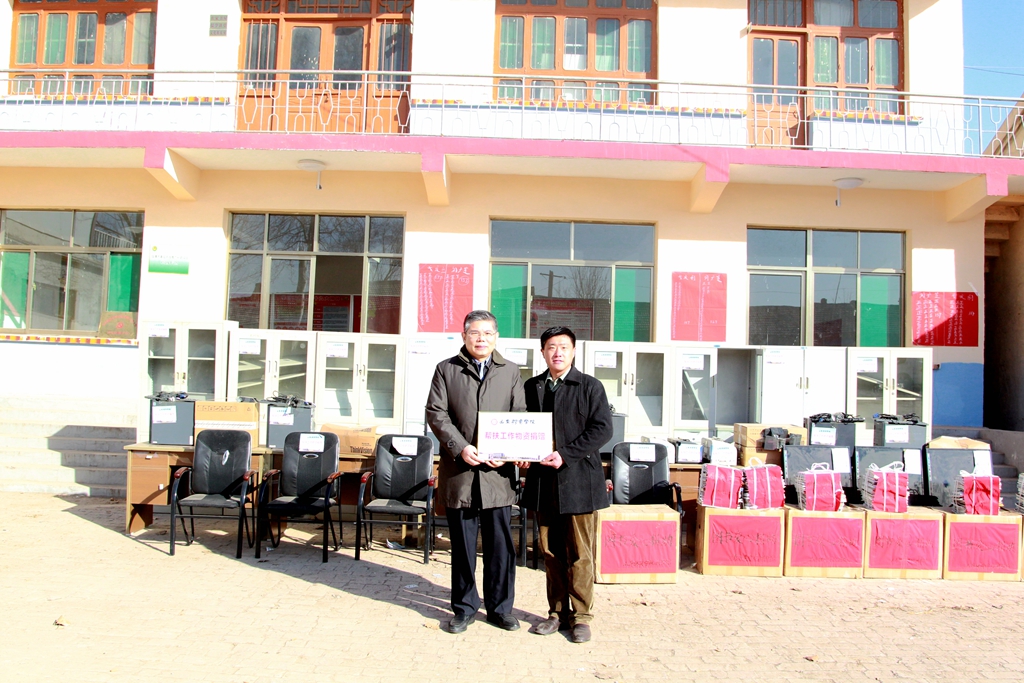 任继滨代表学校将援助物资捐赠给帮扶村,这些物资中,办公桌椅、文件柜、电脑、打印机等物资,用于改善帮扶村办公设施和条件;篮球架、篮球、足球、电视等物资,用于丰富群众精神文化生活;农业技术、科普知识等书籍,用于帮助群众增长知识技能,提高脱贫能力,增强致富内生动力。