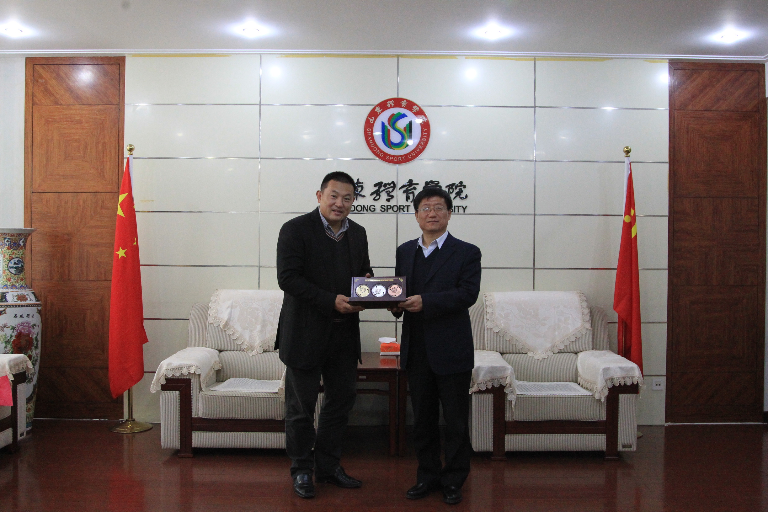 山东体育学院党委副书记、齐鲁体育文化遗产博物馆筹建工作领导小组副组长张云龙代表学校接受捐赠,对王权先生的到来表示热情欢迎,感谢他对齐鲁体育文化遗产博物馆建设给予的关心和支持,并向王权先生颁发了捐赠证书。山东体育学院宣传部统战部部长、齐鲁体育文化遗产博物馆筹建办主任任杰介绍了齐鲁体育文化遗产博物馆筹建工作进展及展区分布情况,谈及天津全运会期间,合作助力山东代表团夺金摘银揽铜的话题,双方倍感亲切。王权表示,建成齐鲁体育文化遗产博物馆是体育界的幸事,多年来,个人出于对体育文化的热爱,收藏了一些纪念品,回去后将加以整理,继续捐赠。