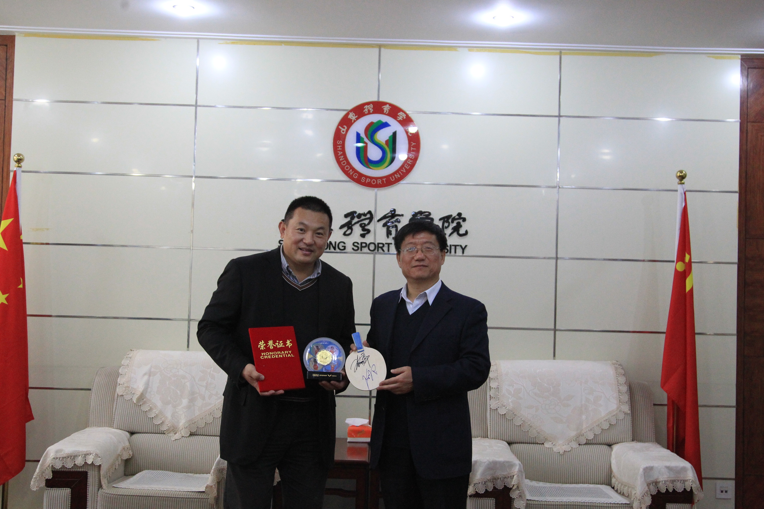 11月13日,山东省运动康复研究中心主任、山东体育学院硕士生导师王权向山东体育学院齐鲁体育文化遗产博物馆捐赠第11届全运会金银铜奖牌、奥运冠军张继科、李晓霞签名的乒乓球拍、中国力量纪念牌、体育风采纪念邮票等。