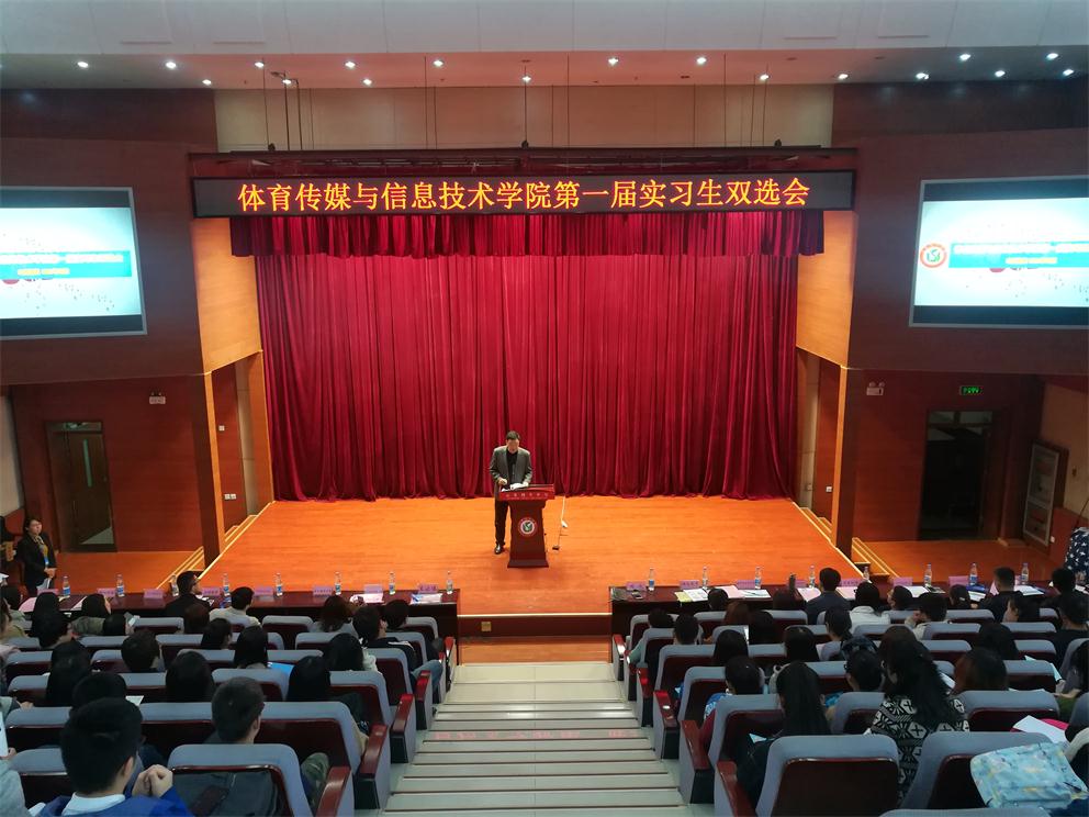 2017年10月13日上午九点,体育传媒与信息技术学院第一届实习双选会在综合楼二楼报告厅举行。体育传媒与信息技术学院院长王必琪、党总支书记刘成,2014级英语专业、计算机科学与技术专业实习生,部分专业教师以及19家社会单位300余人参加会议。副院长卢朝霞主持会议。