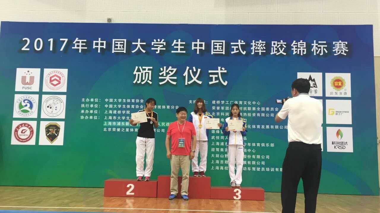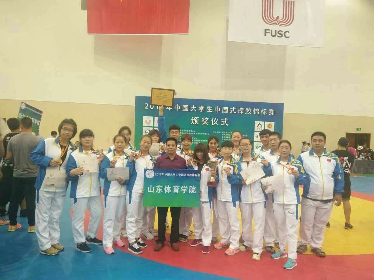 8月9下午,2017中国大学生中国式摔跤锦标赛在上海建桥学院落下帷幕。山东体育学院中国跤队员在崔树和老师带领下,顽强拼搏,发挥出色,夺得女子乙组(女子专业组)全部8个级别中的5金3银4铜的佳绩。其中,张梦瑶获48公斤级冠军,陈小雨获65公斤级冠军,王聪获70公斤级冠军,苏日古格获75公斤级冠军,刘毅君获75公斤以上级冠军。(武术学院 张茂林)