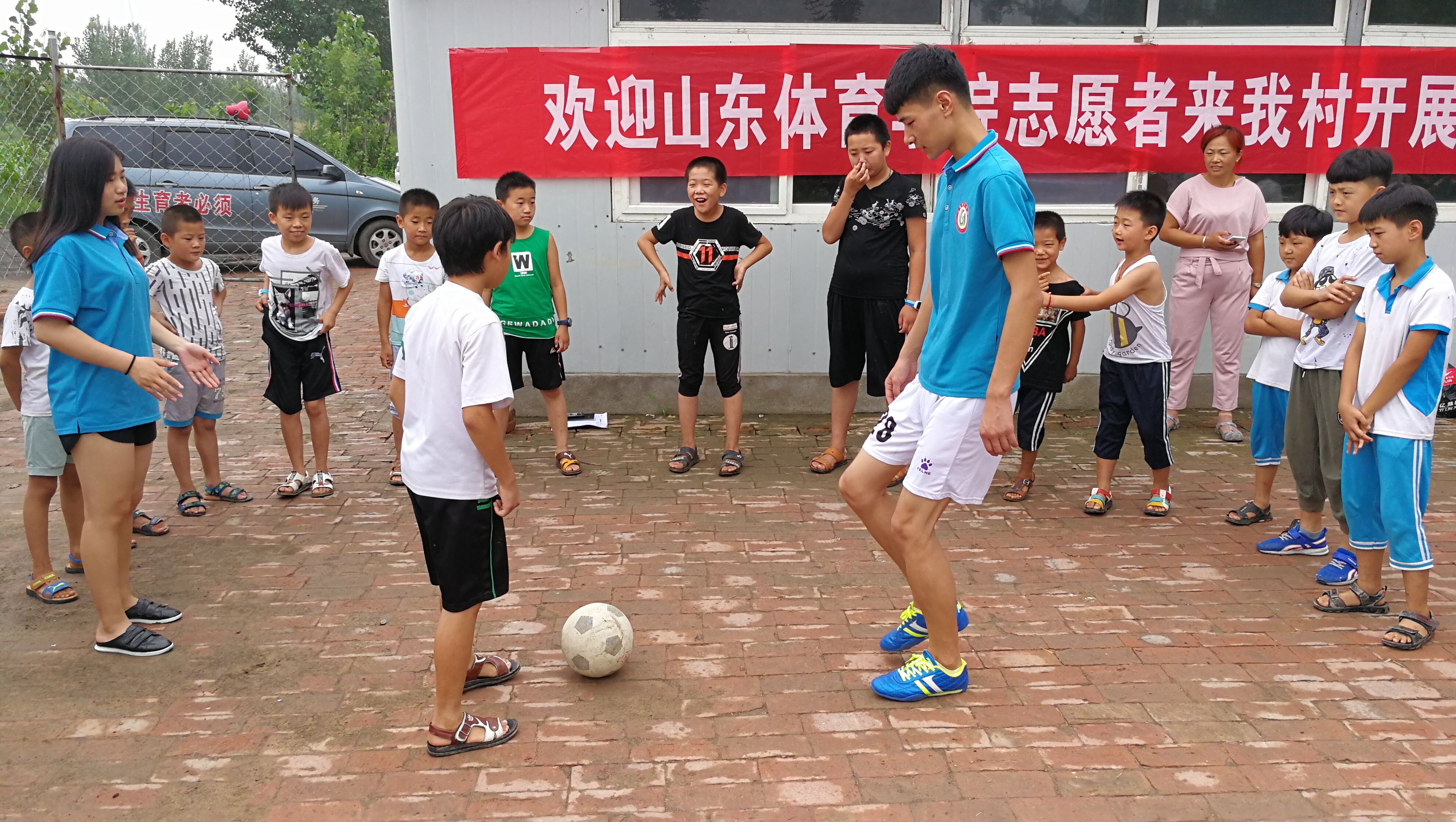 7月23日,山东体育学院“千村关爱 -足球伴你成长”大学生暑期社会实践团队来到德州市庆云县徐园子乡马古台村,对村里的孩子进行了足球知识的讲解及足球运动的实地教学。首先由实践团队志愿者严建文为孩子们介绍了足球的起源、现代足球的区别以及足球比赛中的比赛规则和注意事项。足球知识讲解结束后,实践团队志愿者严建文、沈甜帅带领孩子来到室外,进行实地的足球教学活动。为了避免孩子们在活动过程中受伤,志愿者们首先带领孩子进行了热身活动,随后教授了孩子们最基本的传球、运球动作,并通过游戏的形式,在活动中传授足球比赛的技巧。最后,足球教学在一场小型的足球比赛中落下帷幕。