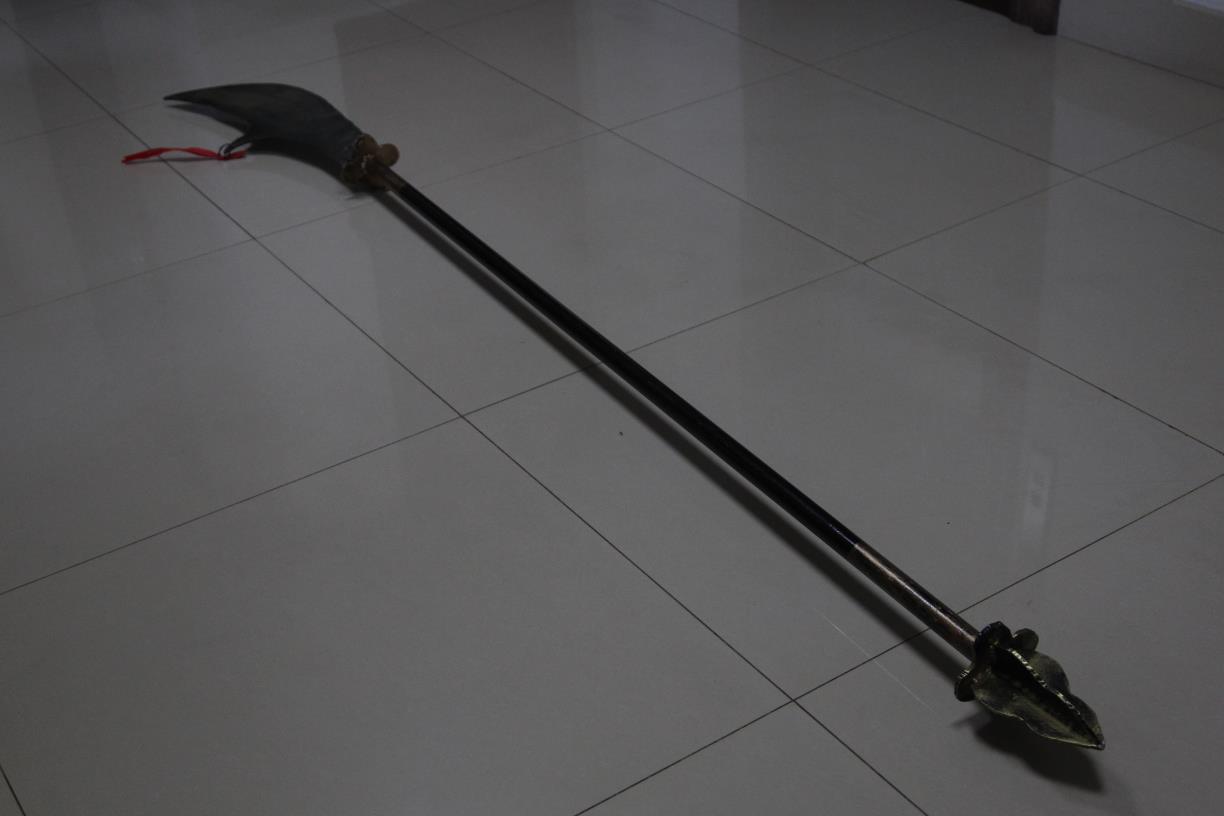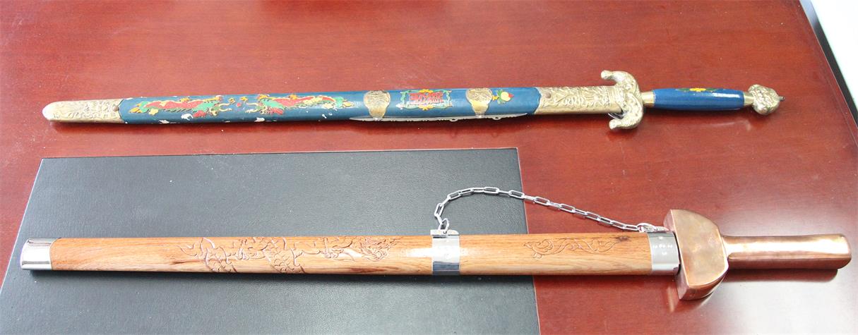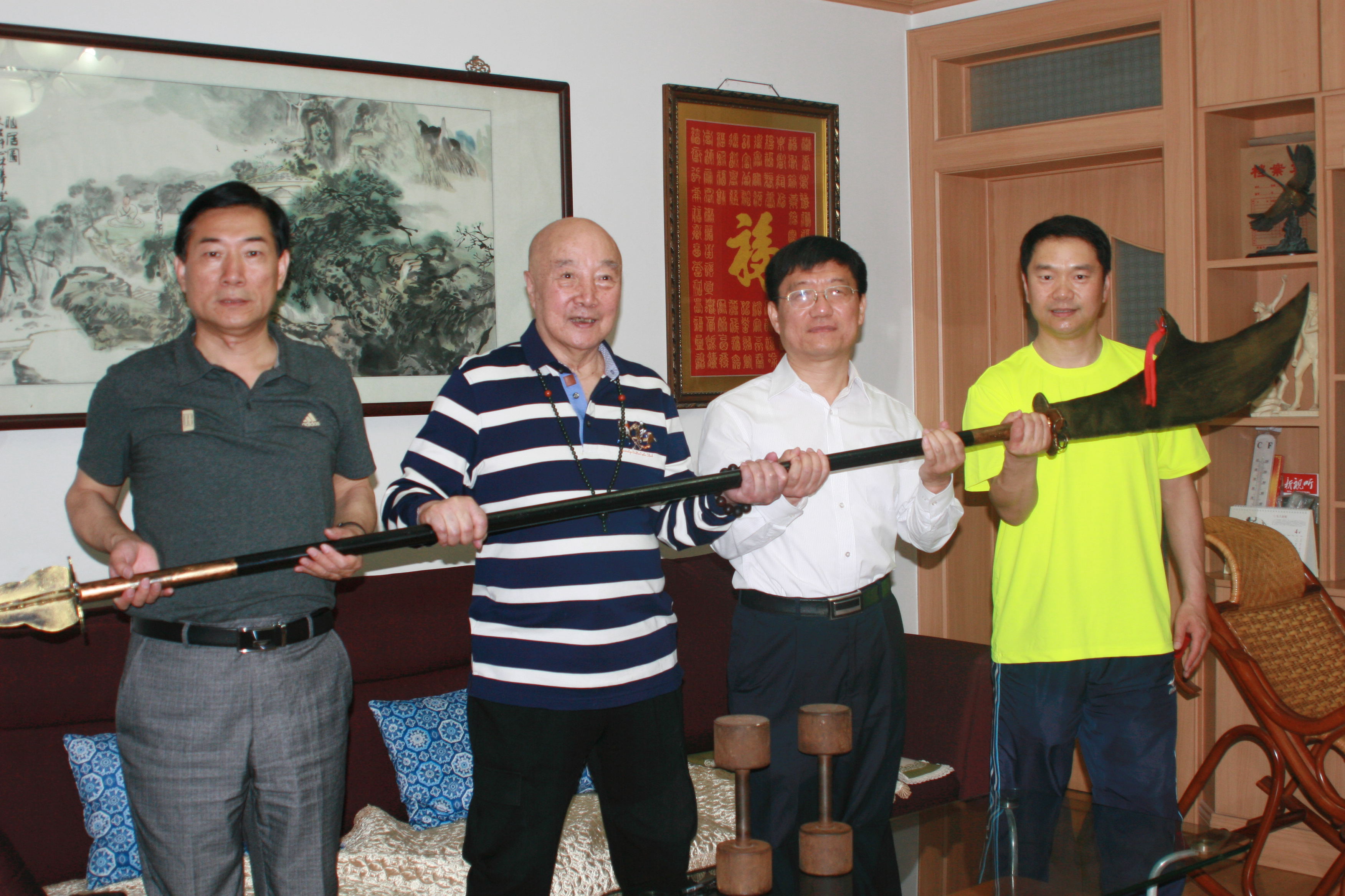 于海先生此次捐赠了4件器械,其中几十斤重的紫铜螳螂剑和螳螂大刀都是于海先生平时炼内力所用兵器,福禄螳螂剑是日常训练和参加比赛以及表演活动时所用兵器。一副抓手被摩擦得光亮润泽的钢制哑铃则是他日常徒手炼臂力所用器具。有些器械于海先生已使用了四十余年。