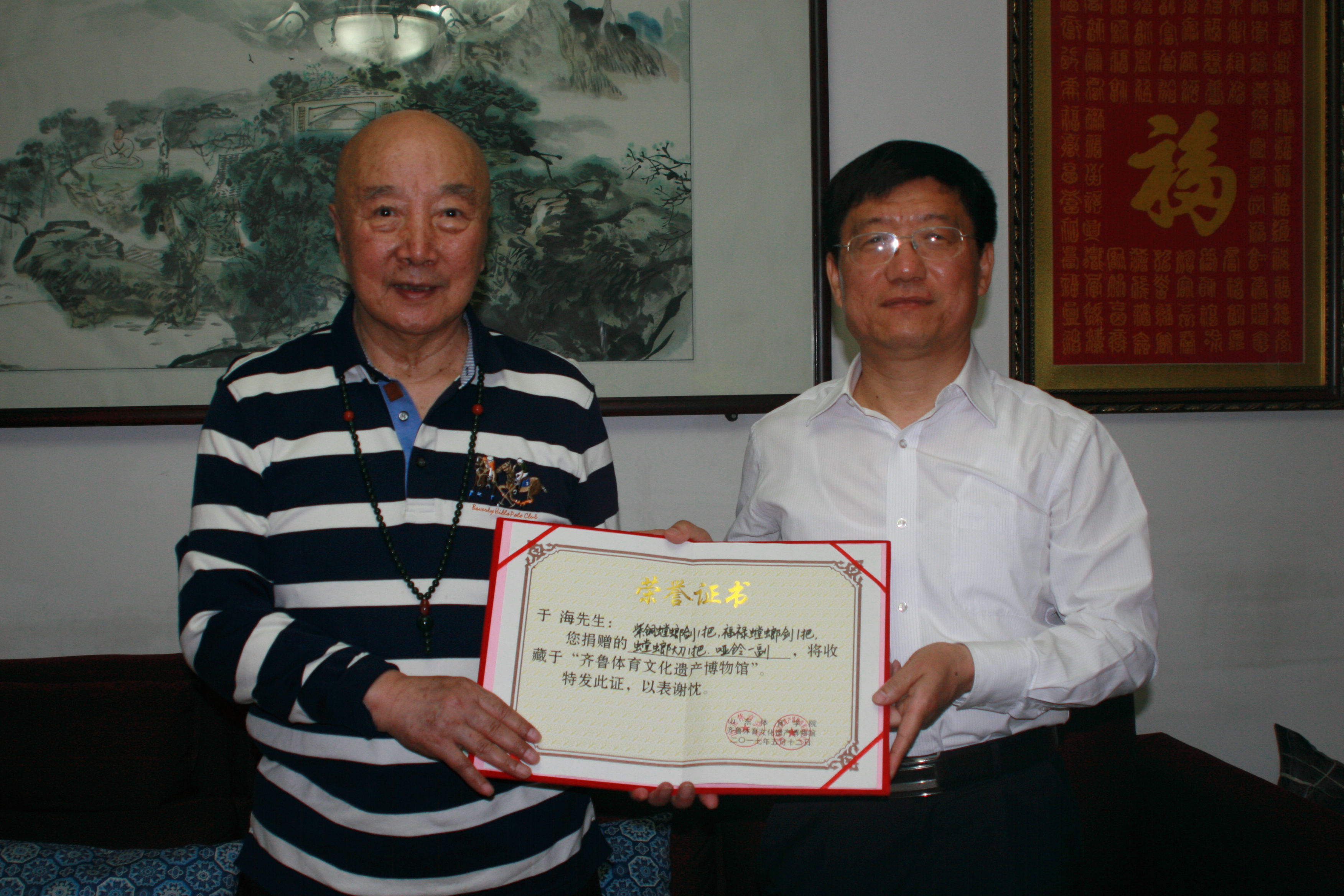 于海先生表示,螳螂拳是我们山东土生土长的代表性拳种之一,是我们山东武术的精华,应该发扬光大。我是山东人,很高兴能为齐鲁体育文化遗产博物馆略添砖瓦,为弘扬悠久的齐鲁体育文化略尽绵薄之力。这些跟了我几十年的螳螂剑、螳螂刀能找到一个好的归宿,也让甚感欣慰。我愿继续全力支持齐鲁体育文化遗产博物馆和山东武术事业的发展。