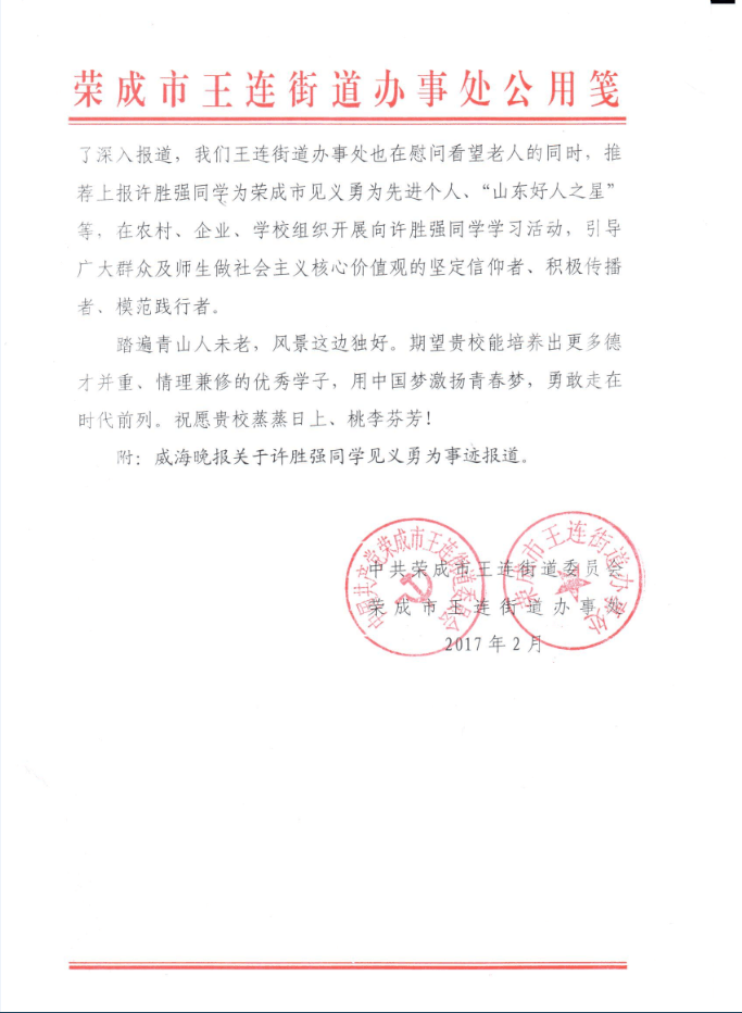 许胜强火海救人的先进事迹引起当地媒体的广泛关注,纷纷对许胜强不惧危险、挺身而出、舍己救人的感人事迹进行了深入报道。荣成市王连街道办事处推荐上报许胜强为荣成市见义勇为先进个人、“山东好人之星”等,在农村、企业、学校组织开展向许胜强同学学习活动,引导广大群众及师生做社会主义核心价值观的坚定信仰者、积极传播者、模范践行者。(宣传部)