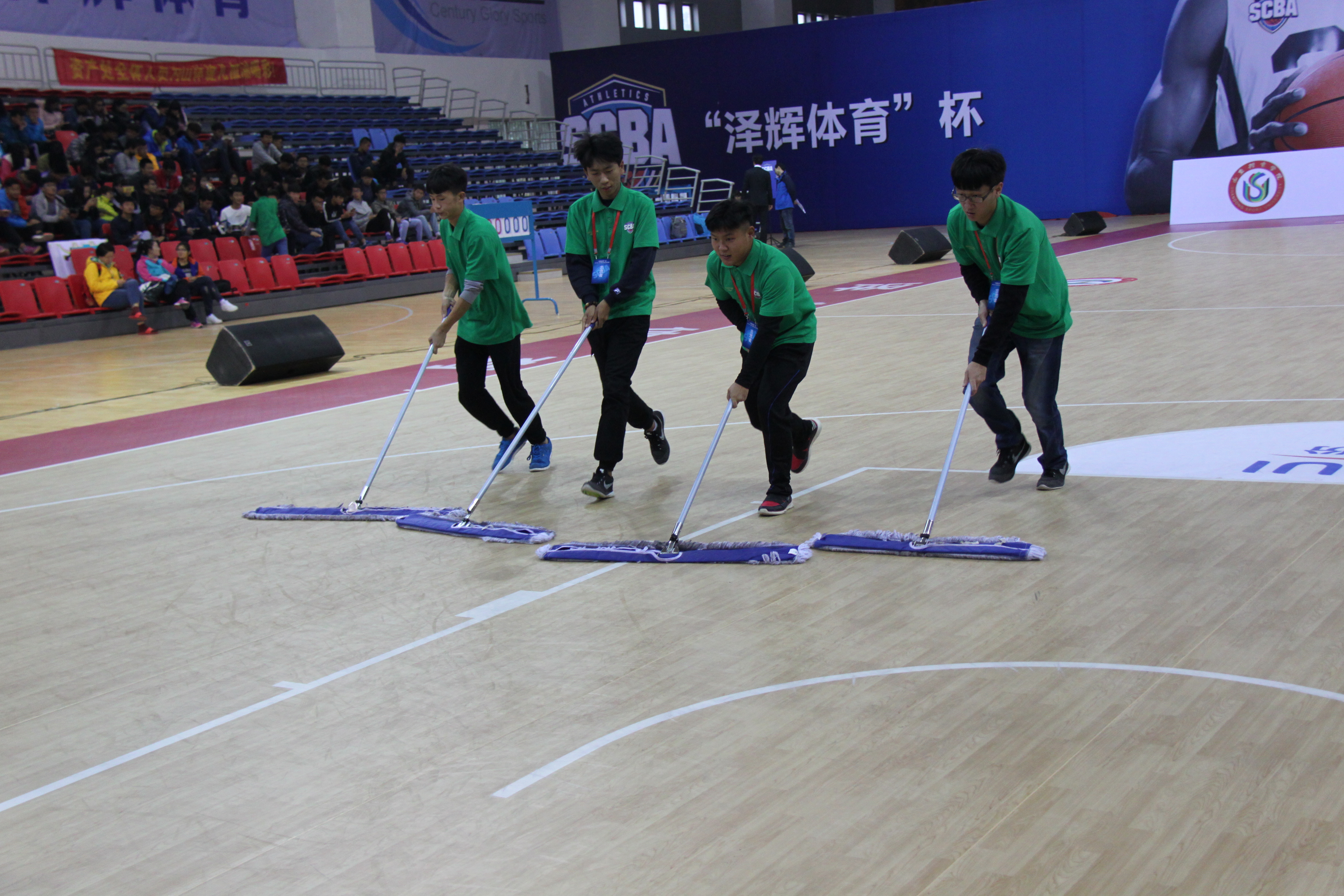 每场比赛中场休息时,赛场中央会出现4位身穿绿色志愿者服装的志愿者,他们手推拖把迅速通过场地,将地上的污物擦拭干净。其他多位志愿者快速将场地内散落的篮球归位。场馆服务的14位志愿是所有志愿者中最辛苦、服务时间最长的一个群体。比赛期间,他们最长的服务时间达到一天14小时。志愿者张培文坦言:“比赛的这些天,我有连续10天没洗澡了,而且有几天没有顾得上吃晚饭。场上实在太忙了,不敢离开。有的时候真想躺在长椅上睡一会儿。”他说:“虽然这个工作有些熬人,但是苦也好,累也好,我们终于顺利的完成了学校交给的任务,收获的是伙伴间的信任和友谊。我相信,团结就是力量。”