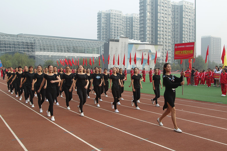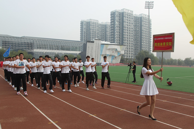 开幕式上,参加入场的红旗队,花束队,裁判员代表方队,各运动员代表队步伐有力,斗志昂扬,充分展现了山东体育学院广大师生的风采和朝气。