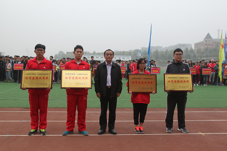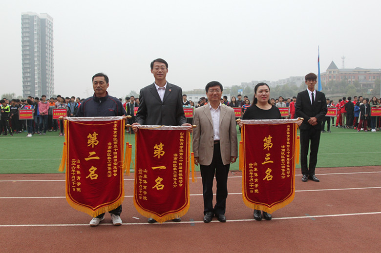 韩冬、张云龙、原维佳分别为获得体育道德风尚奖代表队、教工团体总分前三名代表队、学生团体总分前六名代表队颁奖。