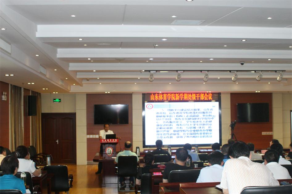 韩冬在讲话中指出,上半年是学校发展极不平凡的一个学期。一是任务艰巨。编制好学校事业发展“十三五”规划纲要、开展“两学一做”学习教育、省委第五巡视组进驻学校开展为期三个月的专项巡视以及整改落实工作、省直机关建购职工住房整改落实工作、编制《山东体育学院综合改革方案》等工作,都是事关全局乃至学校存亡与发展的大事,任务繁重,体现了开局之年、改革之年、发展之年的应有之义。二是成绩卓著。上半年,面对压力,学校突出发展主题,大力推进改革,党的建设、学校顶层设计、教学科研、创新平台建设、学科专业、人才工作、开放办学、综合服务保障等方面均取得了新成绩新进展新突破,形成了快速发展的良好势头。特别是暑假期间喜讯不断。招生形势喜人,今年招生录取学生达到2106人,历史上第一次实现了体育、艺术、文、理等学科19个招生专业全部第一志愿录取的目标;我校9名在校生、毕业生和知名校友参加了第31届里约热内卢奥运会,李晓霞、杨方旭、孙一文等奥运选手为学校获得2金2银2铜的优异成绩;我校“2015年山东省高校骨干学科教学实验中心建设工程项目”在第三方评估中,获得充分肯定和高度评价;我校申报的“齐鲁体育文化遗产博物馆”获批2016年齐鲁优秀传统文化传承创新工程第一批重点项目,并获百万元专项资助经费。这些工作的开展,这些成绩的取得,来之不易,凝聚了全校教职工的心血,是全校教职工无私奉献、克服困难、凝心聚力干出来的。他代表学校党委和行政,对大家表示最诚挚的感谢。三是任重道远。成绩固然喜人,但形势不容乐观,面临的内部、外部挑战都非常严峻。我们学校总体来看还是底子太薄、自身高端人才少、作为专业性院校的体育学科特色不鲜明、水平总体不高等。综合改革和“双一流”的冲锋号已经吹响了,我们考虑的不再是冲不冲的问题,而是必须冲怎么冲的问题。而且现在各个高校比拼的不再是速度而是加速度。如果没有强大的加速度,发展的结果很可能仍是“等距离落后”,甚至极有可能会进一步拉大差距。作为体育人,我们都理解:体育比赛固然重在参与,不以胜负论英雄,同时英雄就要敢于争先、敢于争第一。所以,我们必须拿出体育人的精气神,以百倍的热情与干劲,投身到山东体育学院的建设发展中去。