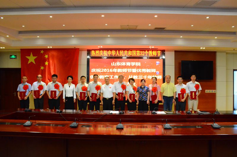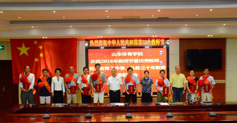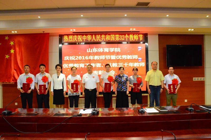 会上,张艳霞宣读了《关于表彰2013-2015年度校级优秀教师、青年优秀教师和优秀教育工作者的决定》,任运河宣读了《关于表彰2016年度从事教育工作满30年教师的决定》,学校领导为荣誉称号获得者颁发了荣誉证书,全体参会教师在国旗下庄严宣誓。 王毅在代表校党委向各位获奖者表示热烈的祝贺,向为学校贡献了30多年青春热血的各位老教师表示崇高的敬意,特别向在教学、科研、训练、管理、服务等岗位上辛勤耕耘、默默奉献的全体教职工致以节日的慰问和美好的祝福!王毅指出,当前,高等教育改革已经进入了深水区、攻坚期,全国高校包括各体育院校都在争创一流、加快发展。我们作为山东省唯一一所独立设置的普通高等体育院校,有近60年的发展历史和深厚积淀,为体育事业和山东地方经济社会发展做出了重要贡献。今天上午,我代表学校参加了省领导会见山东奥运健儿暨山东省里约奥运会总结会,我们学校有9名在校生、毕业生或知名校友参加了里约奥运会,李晓霞、杨方旭、孙一文、张成龙等共获得2金2银2铜的优异成绩。我特别自豪,不仅是因为这是我们的学生,更因为这些成绩对我们学校是极大的鼓舞和推动,证明山东体育学院有基础有能力走在前列、争创一流。