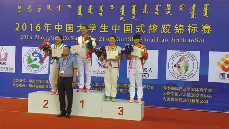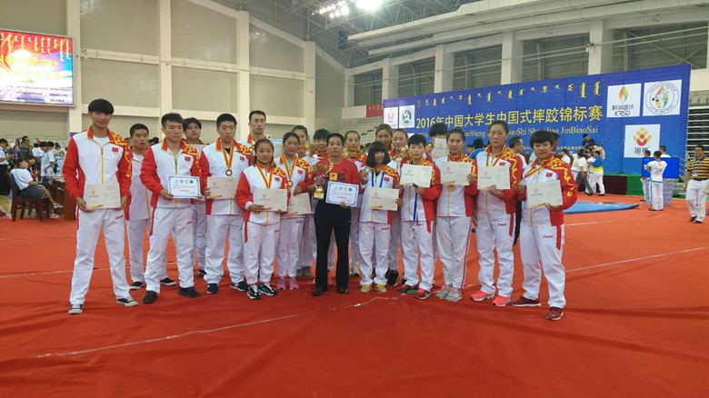 近日,2016年中国大学生中国式摔跤锦标赛在内蒙古锡林郭勒职业学院体育中心落下帷幕。我校中国跤代表队在主教练崔树和老师的带领下,获得了4金4银7铜、2个第五名和女子团体冠军的好成绩。崔树和老师获得本次大赛“优秀教练员”称号。