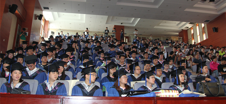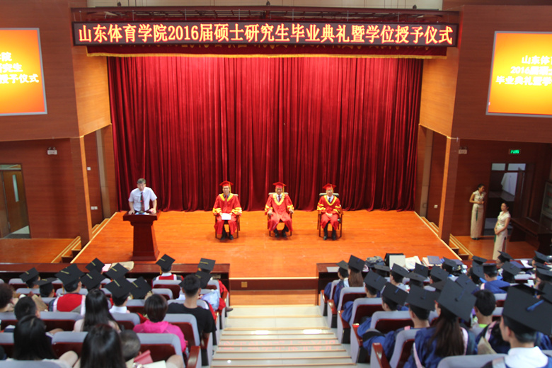 2016年7月6日上午,学校在济南校本部1号教学楼二楼报告厅隆重举行2016届研究生毕业典礼暨学位授予仪式。山东体育学院学位委员会主任、院长韩冬教授、山东体育学院学位委员会副主任、党委副书记张云龙教授、山东体育学院学位委员会副主任、副院长毛德伟教授及部分导师、全体毕业研究生和学生家长参加了毕业典礼。毕业典礼和学位授予仪式在庄严的国歌声中开始,研究生部主任吴耀宇教授主持了毕业典礼。