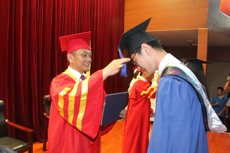毛德伟副院长宣读了《2016届教育学硕士学位和体育硕士专业学位授予名单》。随后,韩冬、张云龙、毛德伟三位院领导为每一名获得学位的研究生颁发了硕士学位证书。他们与毕业生一一握手,为他们拨动象征着荣誉的流苏,颁发学位证书并合影留念。典礼现场欢歌笑语,同学、家长纷纷拿出手机记录下这一生令人难忘的瞬间。学位授予仪式结束后,院领导、研究生导师和全体毕业生在山东体育学院综合楼楼前合影留念。
