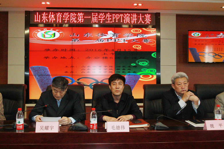 4月15日上午,我校在济南校本部办公楼六楼会议室举办了山东体育学院第一届PPT演讲大赛决赛。副院长毛德伟出席活动。学生处处长张疆之主持。研究生部、教务处、宣传部、学生处、团委、运动基础科学学院等部门负责人参加活动。