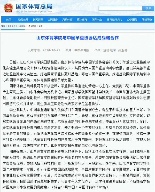 【国家体育局·首页新闻资讯】山东体育学院与中国举重协会达成战略合作